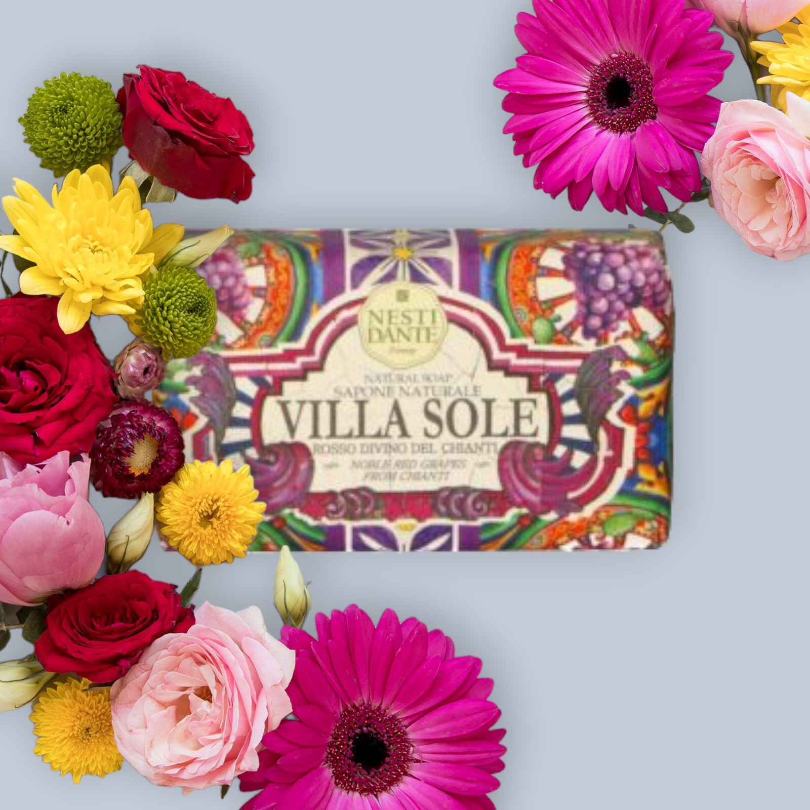 Villa Sole is een collectie van drie natuurlijke zepen ontstaan uit de bloei van bloemen, fruit en citrusvruchten op een zonnig terras met uitzicht op de zee bedekt met majolica tegels. De geuren zijn fris en intens en drukt alle facetten uit van de bloem die een fruitsoort wordt voor een diepe en betoverende sensatie.